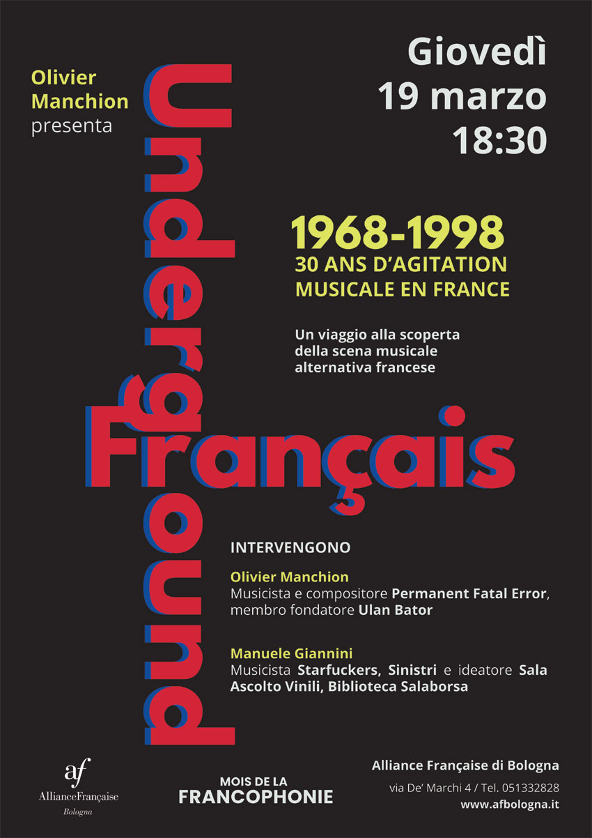 INCONTRO | 18:30 Ingresso libero – “Underground français. 1968-98, 30 ans d’Agitation Musicale en France” Dal maggio 68 all’esplosione dell’indie rock… un viaggio alla scoperta della scena musicale alternativa francese… A cura di Olivier Manchion, musicista e compositore francese, membro fondatore del gruppo Ulan Bator e Manuele Giannini (Starfuckers, Sinistri) Sala Ascolto Vinili di Bologna.